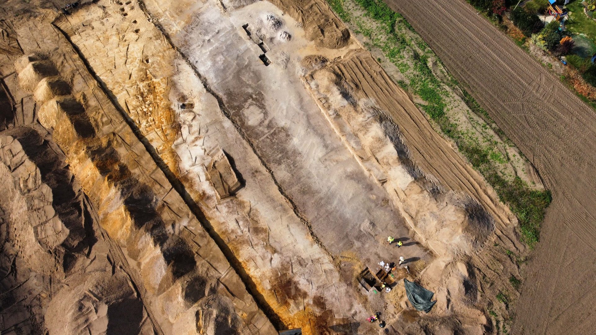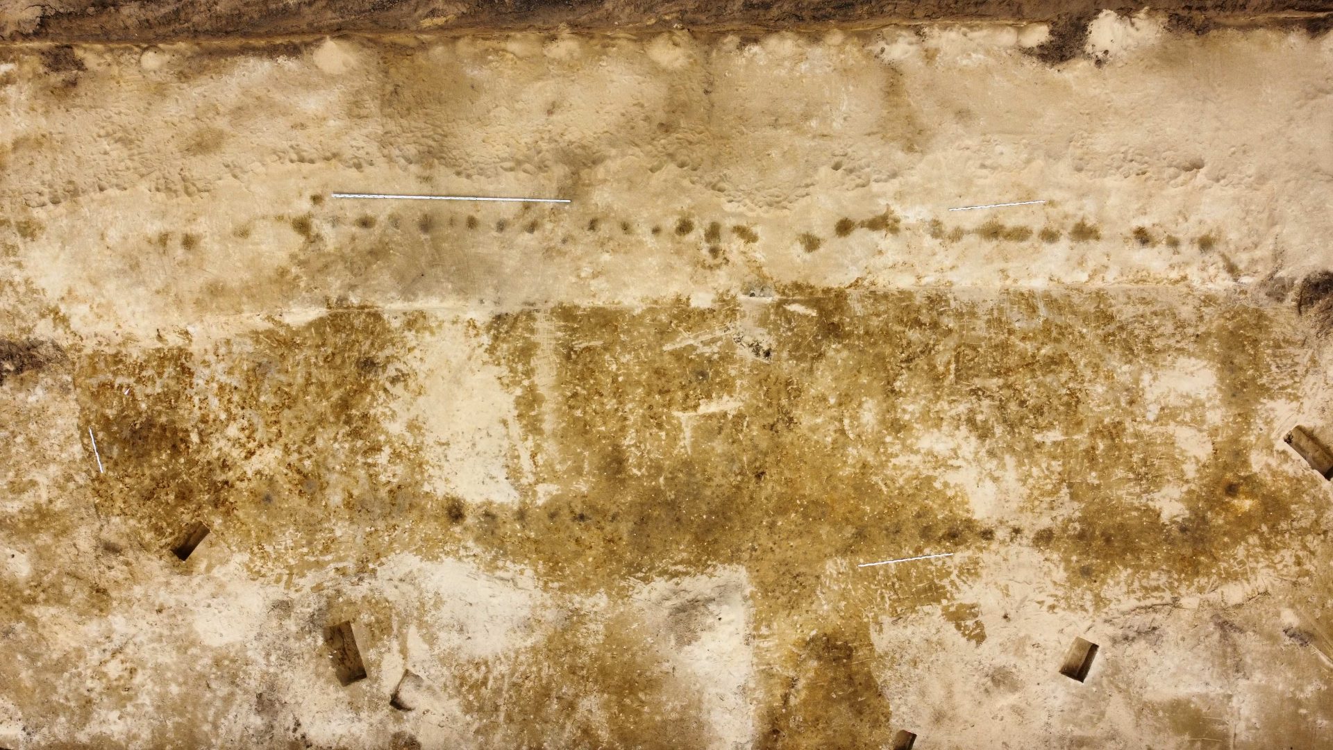 Für die Ausgrabung wurde das Gelände in drei große Arbeitsschnitte unterteilt, die nacheinander geöffnet wurden. Bereits zu Beginn der Untersuchungen stießen die Archäologinnen und Archäologen unter einer rund 40 Zentimeter starken Schicht aus frühneuzeitlichem Plaggenesch auf den vollständigen Grundriss eines eisenzeitlichen Wohnstallhauses. Das etwa 25 Meter lange und 6,5 Meter breite Gebäude bestand aus rund 120 Holzpfosten. Dank der guten Erhaltung im Boden konnten sogar Spuren der ehemaligen Eingangssituation mit festgestampftem Lehm identifiziert werden. In den zugehörigen Pfosten- und Vorratsgruben fanden sich Keramikfragmente, die wichtige Hinweise auf die zeitliche Einordnung geben – vermutlich in die jüngere vorrömische Eisenzeit oder frühe römische Kaiserzeit (etwa 500 v. Chr. bis 150 n. Chr.).