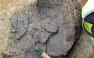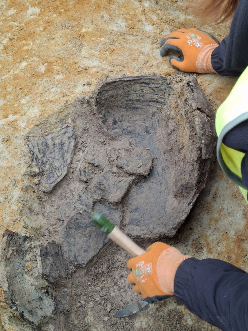 Ein weiterer eindrucksvoller Fund ist eine etwa 1,5 Meter tiefe trichterförmige Grube, in deren Boden eine große Tonschale eingelassen war – vermutlich ein früher „Erdkühlschrank“, in dem verderbliche Lebensmittel kühl gelagert wurden. Das Gefäß konnte vollständig geborgen werden. Das Verfüllmaterial wird derzeit im Labor untersucht, um nähere Erkenntnisse über seine Nutzung zu gewinnen.