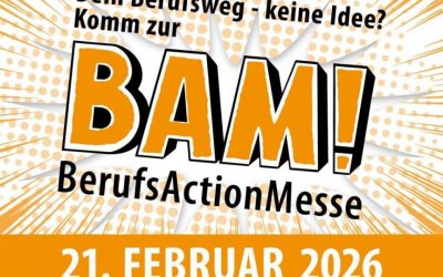 Am Samstag, den 21. Februar 2026 von 10:00 bis 14:00 Uhr sind alle Schülerinnen und Schüler ab Klasse 8, Jugendliche, junge Erwachsene und auch Eltern herzlich eingeladen die Berufs-Action-Messe BAM! an der Neuen Schule Dorsten zu besuchen. Die BAM! präsentiert 63 Ausstellende, größtenteils aus Dorsten, mit mehr als 134 Berufen, verschiedene Bildungsgänge, zahlreiche Angebote zum freiwilligen sozialen Jahr/ Bundesfreiwilligendienst und zum (dualem) Studium sowie Informationen und Beratungen.