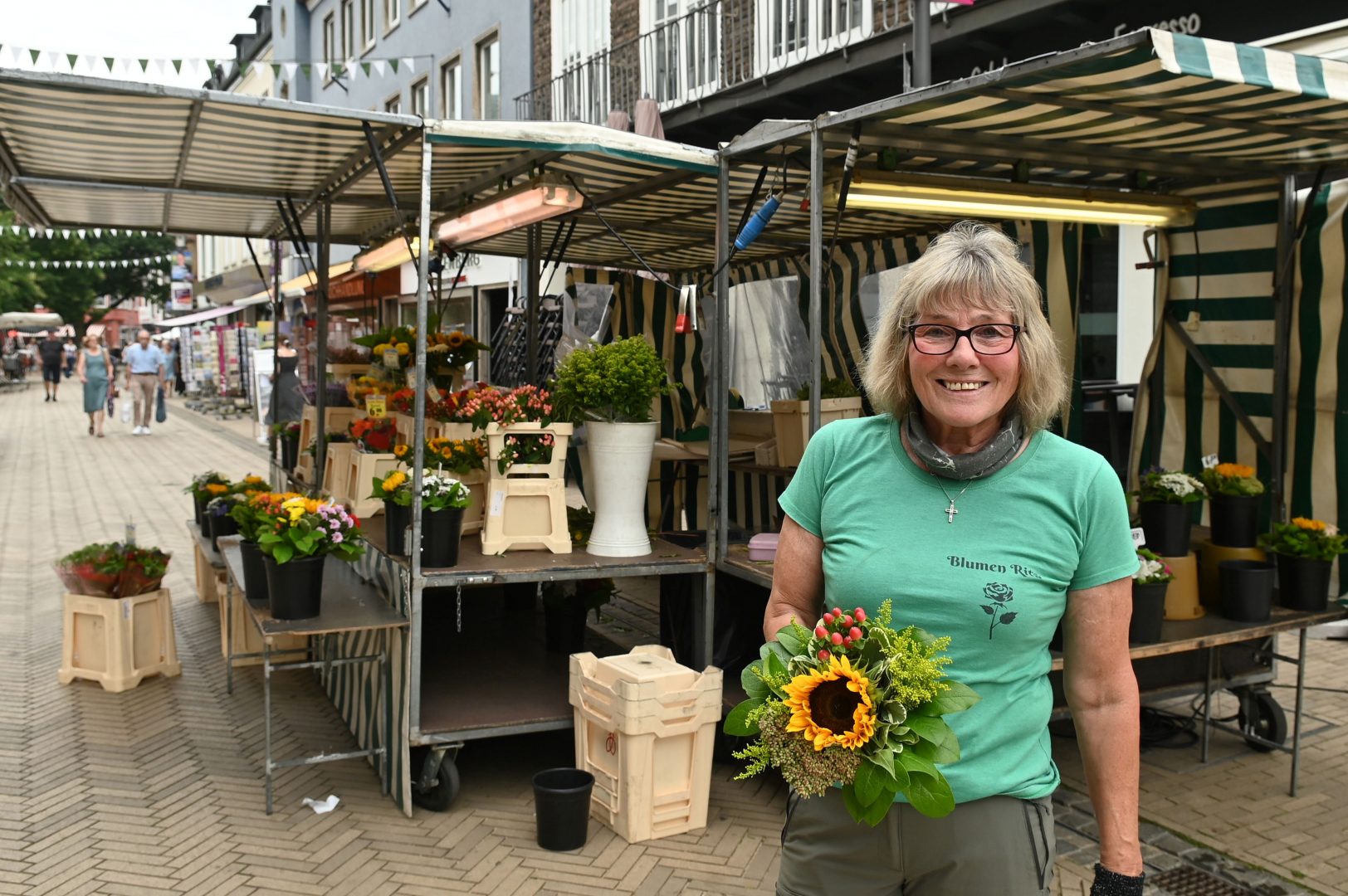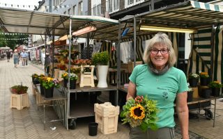 . . . Marktstände von Andreas Unnebrink (Gemüse), Bäckerei Terjung, Pflanzcenter Sandra Grebe, Blumen Rita, Andreas Steinkopf (Käse).